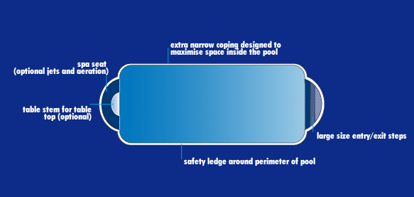 Why does one particular design endure for centuries whilst others are soon forgotten. The timeless elegance of the Classic Roman style swimming pool is as much in vogue today as it was in the days of Ancient Rome. The Roman design is simple, practical and pleasing to the eye. The clever use of a rectangle and two semi-circles also unlocks unlimited possibilities for exciting landscaping concepts. The Leisure Pools Roman swimming pool features broad entry steps at the shallow end with an optional spa seat and table at the deep end. Space inside the pool is maximized by the use of Leisure Pools unique narrow coping design and safety has also been incorporated into the pool by means of a safety ledge. The Roman range features 3 different sizes. The Roman 9.20 and 8.00 is ideal for standard size backyards and the Roman 7.00 is perfect for those areas where space is a problem. specifications |